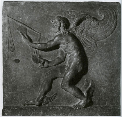 Sa tête arbore une mèche de cheveux qui permet de saisir l'opportunité. Il est pourvu d'ailes aux épaules et aux talons; il a pour atttribut une balance en équilibre sur le tranchant d'un rasoir. |