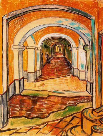 Artaud explique que la peinture linéaire le rend fou. En voyant une exposition de Van Gogh, il a trouvé autre chose : un peintre qui ne peint pas des lignes et des formes, mais la terre et la vie présente. Le clou de Van Gogh n'est pas un point de fuite, c'est une hargne qui tord le cou au destin névrotique des choses. à même les cinq sens : vue, ouïe, tact et odeur. A partir d'objets, de personnes, de matériaux à la simplicité sordide, il tire des feux d'artifice, des épiphanies, un Grand Oeuvre, une transmutation intempestive. Par la peinture peinte, il ouvre la porte d'une réalité mythique, d'une nature non peinte. ------- Quand il est confronté à l'autorité, Van Gogh renoue avec la perspective classique, non sans un certain effroi. Il n'y a plus de terre ni de soleil, plus de jaune ni de bleu, plus d'objet, plus de motif, il n'y a qu'un couloir vide et presque uniformément orange sale, avec au fond une porte énigmatique. La porte de la loi? Celle qu'Artaud dénonçait dans la figure du psychiatre? |