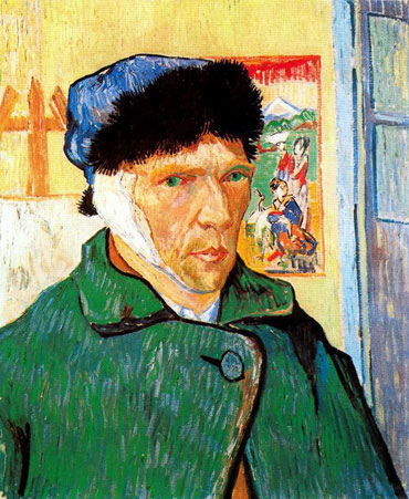 Dans les automutilations sacrificielles, l'aliéné, sous l'empire d'une voix, jette quelque chose hors de soi (arrachement de l'oeil ou de l'oreille, ablation du doigt qui peut être mangé). Le dieu qui se sacrifie ne fait qu'un avec la victime et le sacrificateur. Van Gogh s'altère pour se jeter hors de soi, vomir son être propre. Usant d'une liberté merveilleuse, il porte l'organe tranché à l'endroit qui répugne le plus à la société : une maison de tolérance. Il témoigne ainsi de son amour pour l'objet méprisé et jette sa haine et son dégoût à la figure de ceux qui gardent de leur vie une idée "élevée". [Ici Van Gogh se peint devant une porte entrouverte qui donne sur un tableau en style japonais - réminiscence de Gauguin qui vient de le quitter. Le fond est jaune, contrairement à l'autre tableau peint le même jour sur fond rouge]. |