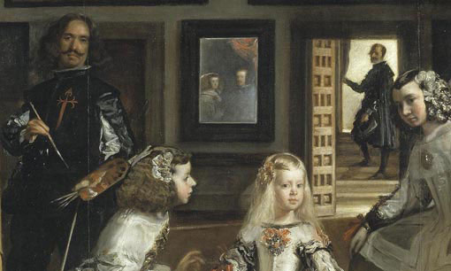 Michel Foucault repère plusieurs centres dans ce tableau : le regard de l'infante, le fond du miroir, le souverain (v. ici une reproduction d'ensemble, avec l'analyse de Foucault). Selon lui, le souverain est le véritable centre symbolique qui se projette et se diffracte dans les autres figures. Cette description ne correspond pas au point de fuite géométrique. Bien que la perspective de Velasquez ne soit pas très rigoureuse, un examen détaillé montre que ce point se situe quelque part entre les deux mains du personnage encadré par la porte, José Nieto Velasquez. Hubert Damisch aimerait le placer près de la main au rideau, même si le point de vue le plus rigoureux le situe plus bas, vers la hauche. En tout état de cause, si le spectateur se place sur l'axe perpendiculaire au tableau qui passe par ce point, alors ce qui se reflète dans le miroir n'est pas, en face, la figure réelle des souverains, mais obliquement la partie centrale de la toile sur laquelle travaille le peintre : la figure peinte des souverains. Ce léger décalage est un piège. Contrairement à ce qu'affirme Foucault, le spectateur, s'il est placé au point de vue du tableau tel que construit par la perspective (légèrement à droite), ne peut pas se voir en souverain. S'il y a symétrie, c'est entre deux mains de deux Velasquez : l'une qui peint et l'autre qui témoigne. Les deux nous observent, nous qui, divisés entre plusieurs regards, ne pouvons pas nous voir dans le miroir puisque nous sommes décalés vers la droite. |