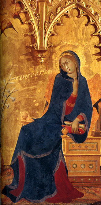 D'après le récit de saint Luc (I, 26-38), le seul des quatre évangélistes qui raconte cette histoire, après avoir marqué son trouble et sa surprise à l'écoute des paroles de l'ange Gabriel (Réjouis-toi, comblée de grâce, le Seigneur est avec toi), la jeune Marie commence par marquer sa surprise. Elle s'interroge. Alors l'ange dit : "Sois sans crainte, Marie; car tu as trouvé grâce auprès de Dieu. Voici que tu concevrais dans ton sein et enfanteras un fils, et tu l'appelleras du nom de Jésus. Il sera grand, et sera appelé Fils du Très-Haut. Le Seigneur Dieu lui donnera le trône de David, son père; il règnera sur la maison de Jacob pour les siècles et son règne n'aura pas de fin". Alors Marie argumente : "Comment cela sera-t-il, puisque je ne connais pas d'homme?". Elle n'est pas naïve, elle est rationnelle, et il faut que Gabriel lui fournisse une sorte de preuve pour qu'elle soit convaincue. "L'Esprit saint viendra sur toi et la puissance du Très-Haut te prendra sous son ombre; c'est pourquoi l'etre saint sera appelé Fils de Dieu. Et voici qu'Elisabeth, ta parente, vient, elle aussi, de concevoir un fils dans sa vieillesse, et elle en est à son sixième mois, elle qu'on appelait la stérile; car rien ne sera impossible à Dieu qui est tout Verbe" C'est seulement sur la base de ce témoignage, qui renvoie à un événement réel et vérifiable par ses propres yeux, qu'elle donne son accord. "Je suis la servante du Seigneur; qu'il m'advienne selon ton Verbe!". --- Dans l'Annonciation de Simone Martini (1333), la Vierge est visiblement méfiante. Les paroles la remplissent de suspiscion, et même le livre qu'elle tient à la main gauche lui échappe. |
