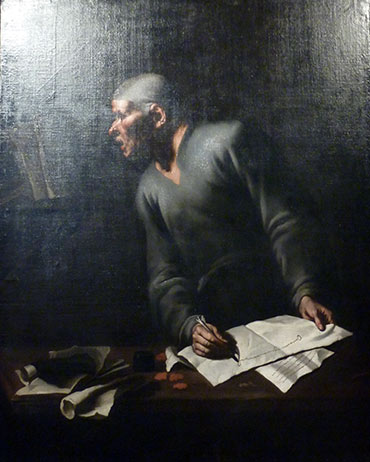 "Un philosophe écrivant", tableau attribué au Maître de l'Annonce aux bergers, actif à Naples vers 1620-50.